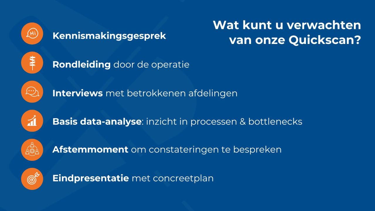 De Quickscan is een praktische en doelgerichte analyse van uw organisatie. In korte tijd brengen onze specialisten de belangrijkste processen, knelpunten en kansen in kaart. U ontvangt een overzichtelijk rapport met duidelijke aanbevelingen en concrete verbeterstappen. Geen dikke rapporten, maar direct toepasbare inzichten waarmee u vandaag nog aan de slag kunt. Door onze aanpak krijgt u niet alleen inzicht in wat beter kan, maar ook hoe u dat efficiënt realiseert met maximale impact op productiviteit, samenwerking en klanttevredenheid.